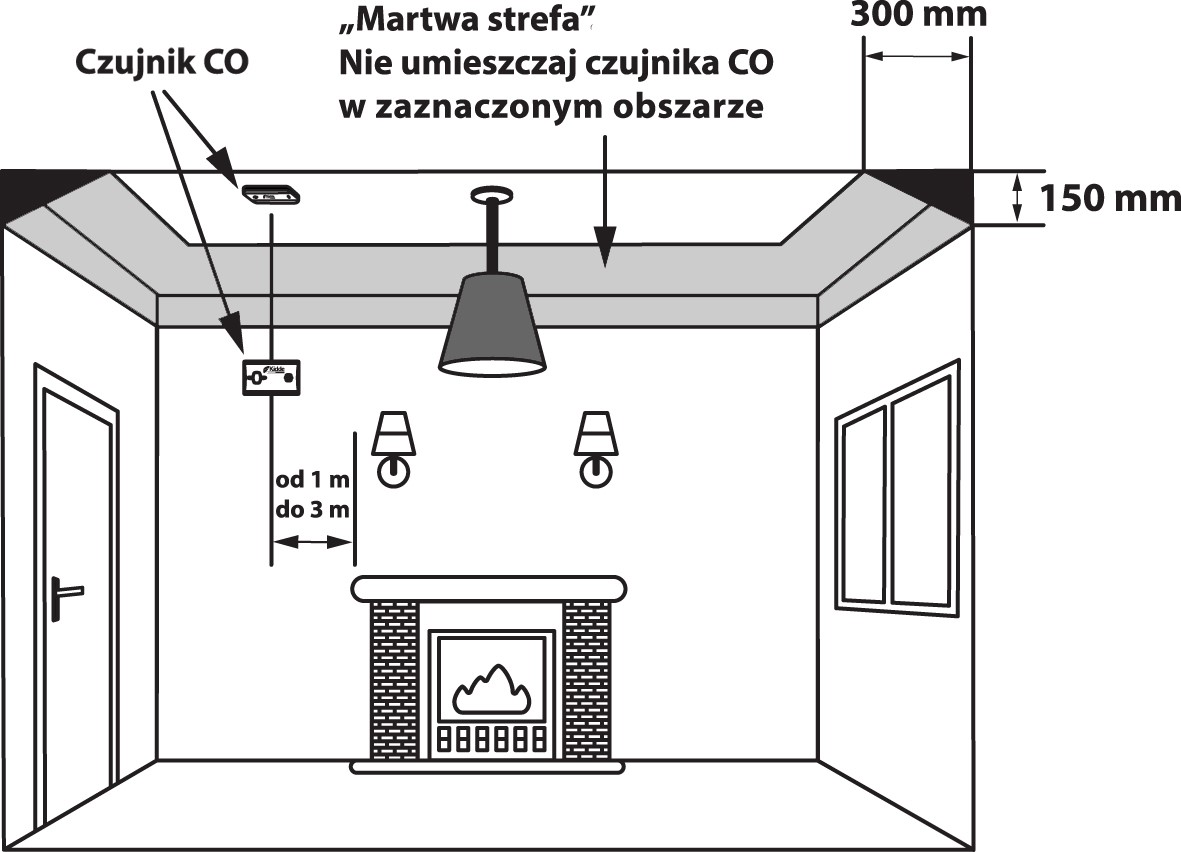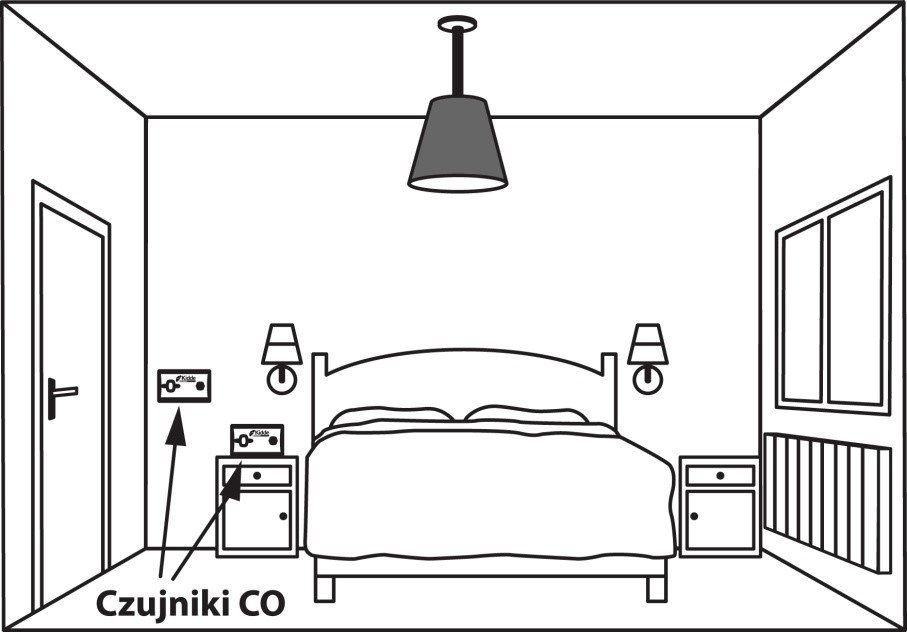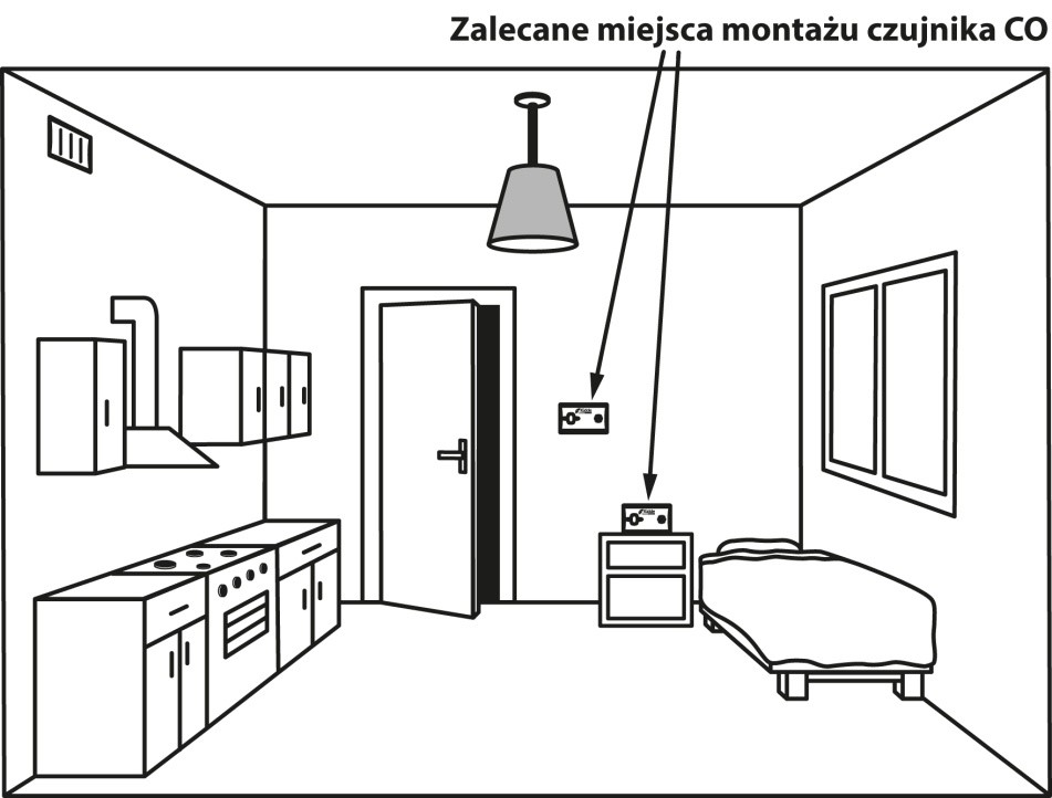 W przypadku lokalizacji takich, które tworzą jedną przestrzeń użytkową wraz miejscem do spania, czujnik tlenku węgla należy umieścić możliwie jak najdalej od kuchenki i jak najbliżej miejsca do spania. Czujnik CO powinien być zawieszony na wysokości dróg oddechowych, czyli tzw. „strefy oddychania”.