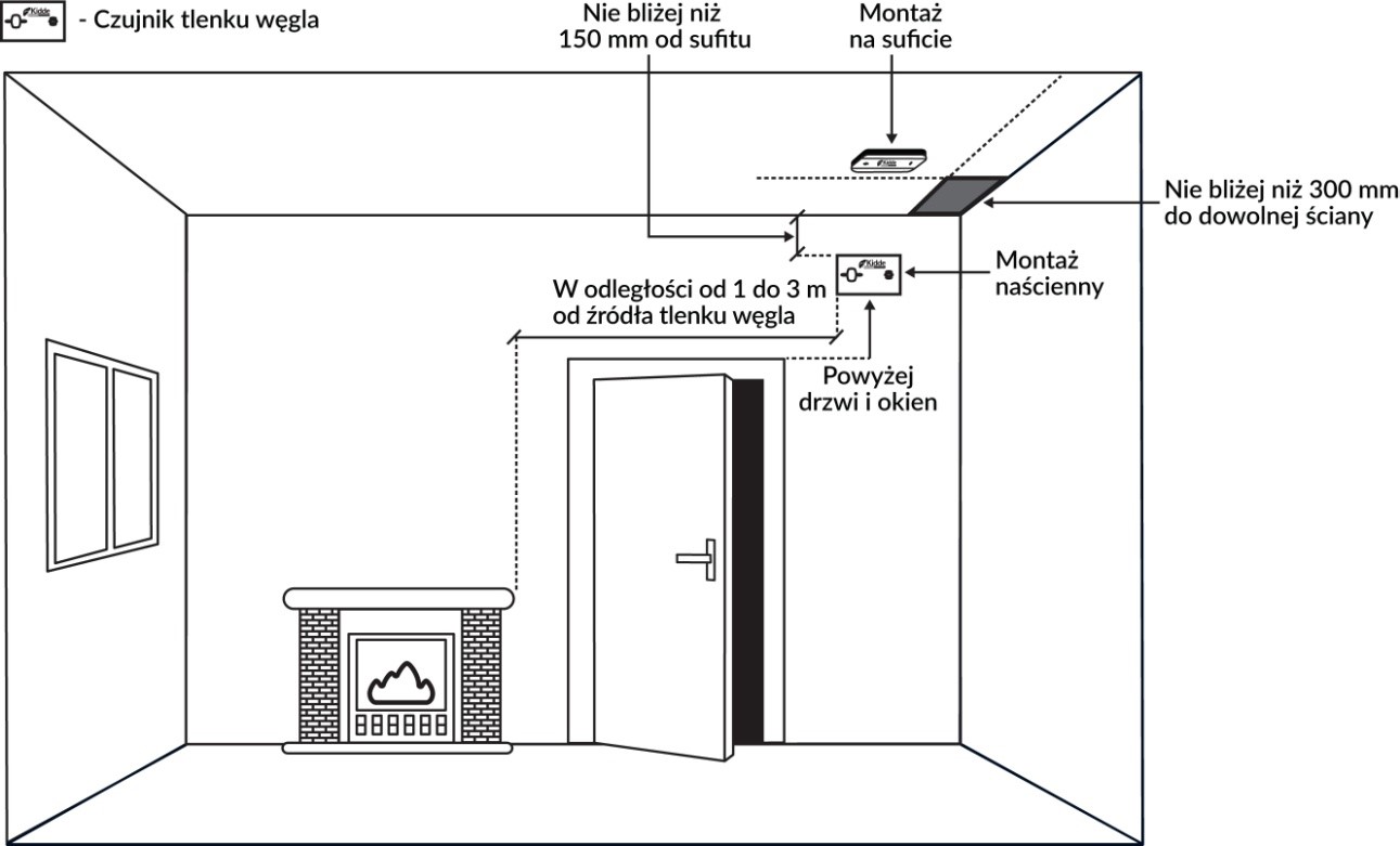 Nie jest możliwe podanie szczegółowych wytycznych odnośnie dokładnego miejsca montażu czujnika CO, które pasowałyby do wszystkich rodzajów pomieszczeń i ich sposobów użytkowania. Podane poniżej wytyczne powinny być brane pod uwagę przy określeniu optymalnej lokalizacji w odpowiedniej sytuacji.