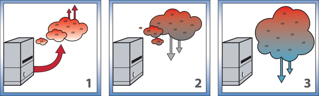 Pomimo, że tlenek węgla ma podobną gęstość do otaczającego powietrza, montaż czujnika CO możliwie blisko sufitu lub na suficie, w pomieszczeniach z urządzeniem emitującym spaliny zalecany jest ze względu na fakt, że tlenek węgla będący częścią ciepłej mieszaniny gazów ma tendencję do unoszenia się do momentu, aż ulegnie ochłodzeniu.