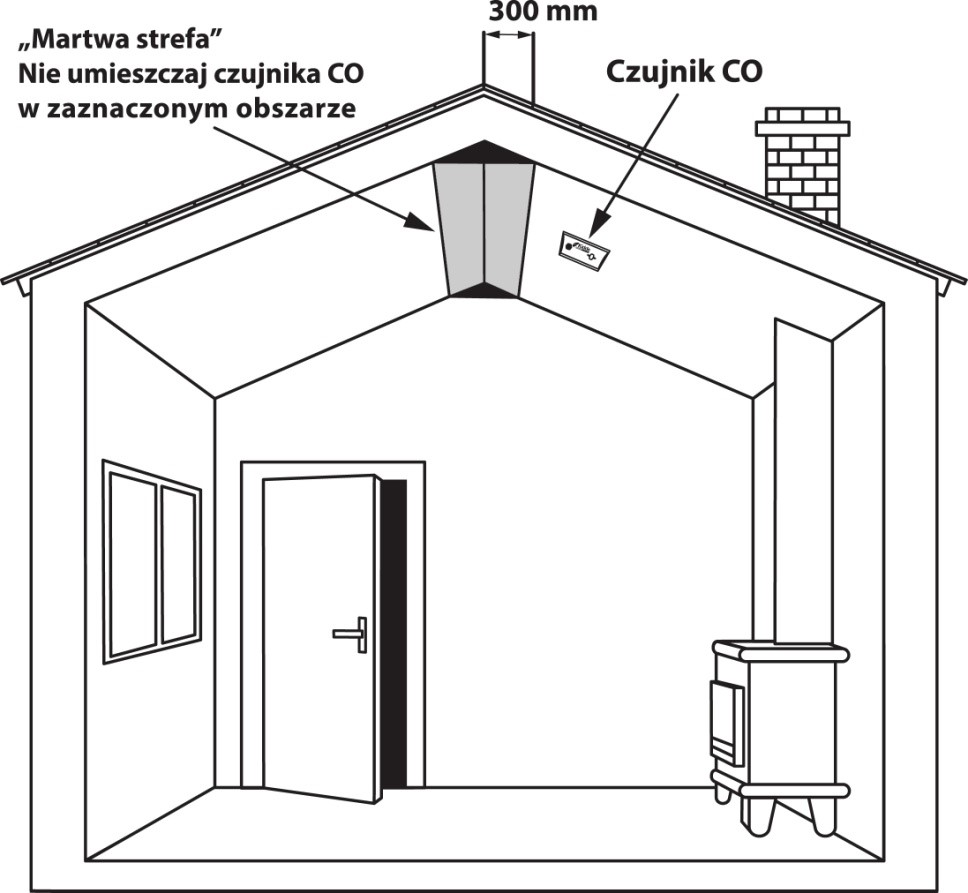W pomieszczeniach z ukośnym sufitem czujnik CO powinien być zamontowany w wysokiej części pomieszczenia.