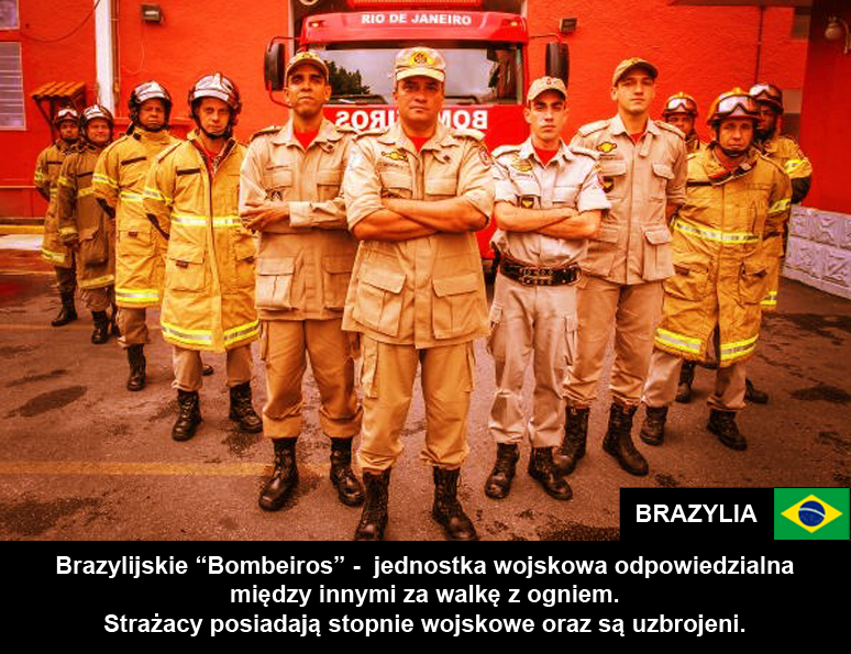 Odpowiednik Polskiej PSP w Brazylii to Corpo de Bombeiros Militar. Jest to jednostka wojskowa, odpowiedzialna między innymi za walkę z ogniem. Jednostka podlega pod Brazilian Army, czyli armię Brazylijską. Strażacy posiadają stopnie wojskowe oraz są uzbrojeni.