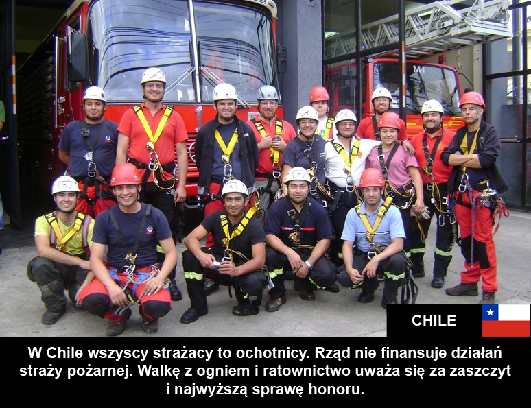 W Chile wszyscy strażacy to ochotnicy. Rząd nie finansuje działań straży pożarnej. Strażacy we własnym zakresie muszą finansować niezbędny sprzęt oraz szkolenia.